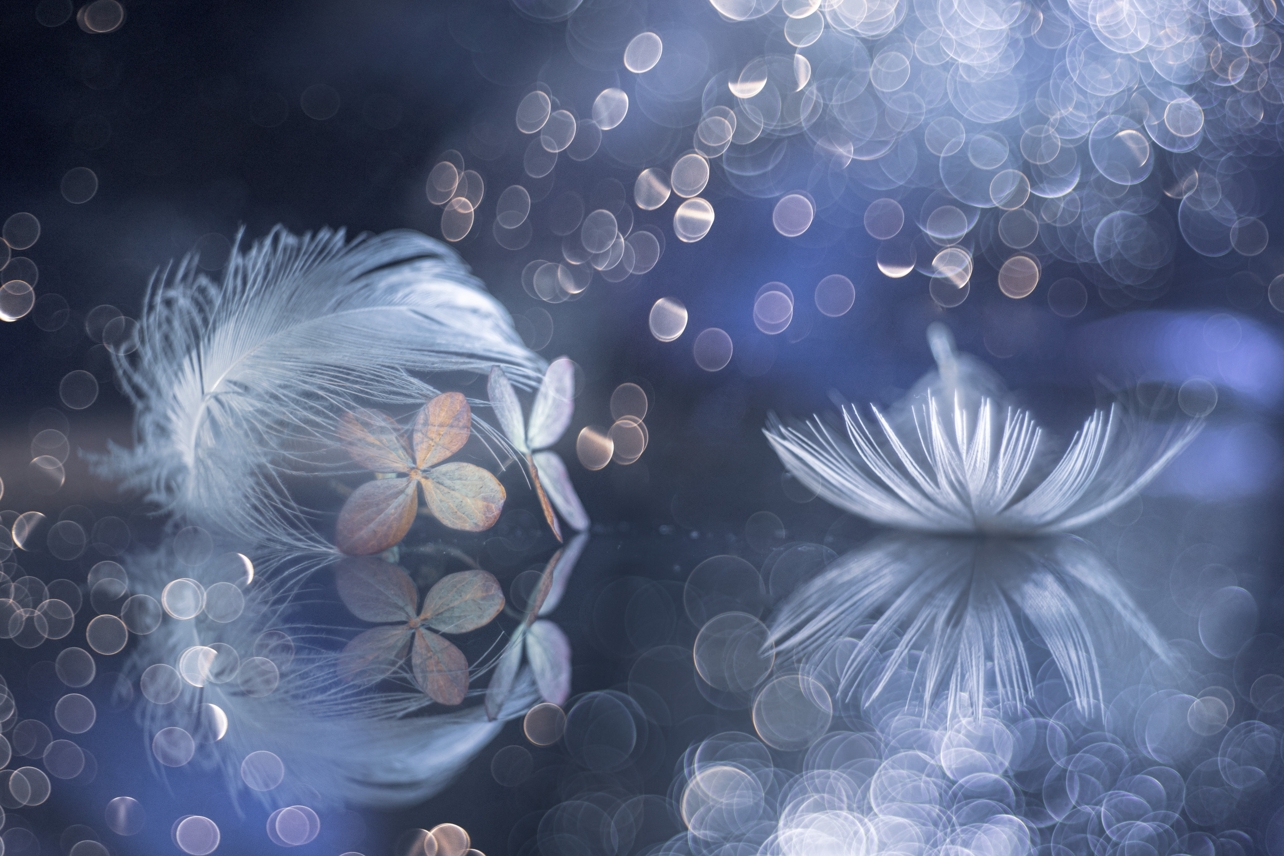 But I can tell something about an unusual photo. The set-up is built on glass and illuminated by a light source and under the glass - as if forming a continuation - another composition is built, which in turn is laid out on the glass where water droplets forming bokeh are located.